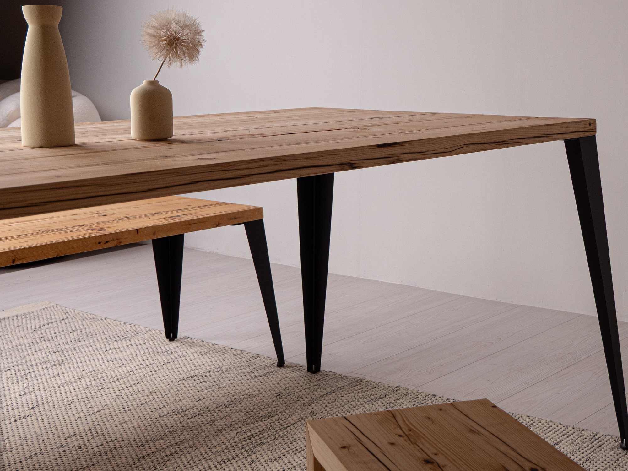 Esstisch aus massivem Altholz auf einem Untergestell aus Stahl